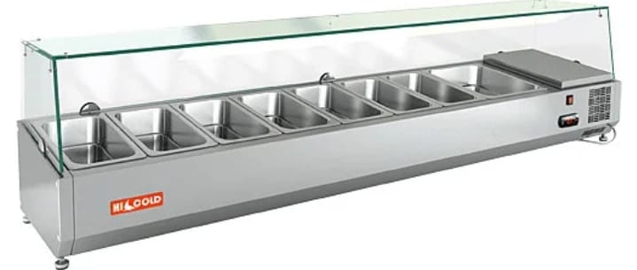 используется на предприятиях общественного питания и торговли для демонстрации, охлаждения и кратковременного хранения салатов, гарниров, закусок и других готовых блюд. Модель оснащена стеклянной надстройкой и ножками. Изделие выполнено из нержавеющей стали.