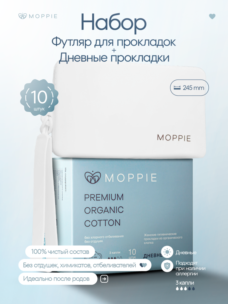 Гигиенические прокладки MOPPIE из органического хлопка обладают естественной впитывающей способностью.