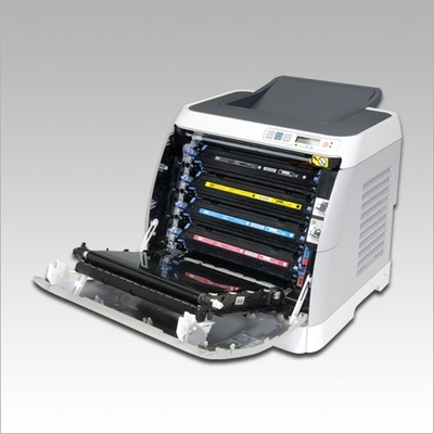 Комплект поставки: кабель питания, CD-ROM, руководство по началу работы с устройством, удлинитель приёмного лотка, крышка лотка для бумаги, 4 картриджа с ресурсом 1000 страниц (исходя из заполнения 5%)